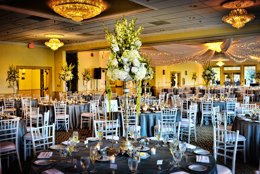 The crystal chandeliers and warm tones provide a romantic ambiance for your guests. The ballroom is open and spacious, with beautiful views of one of our three golf courses.